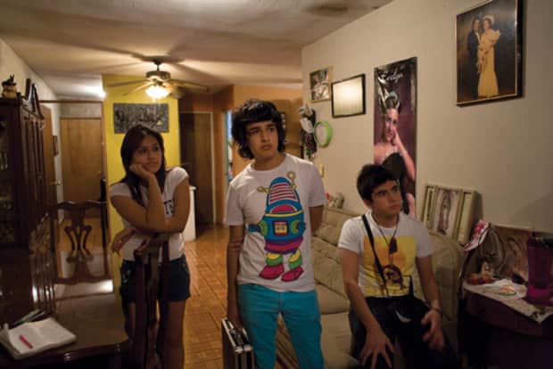 The teen tribes all find meaning in this new music. There are also los Texas, Monterrey’s take on the cholo style; los fachas, emos with a punky edge; reggaetoneros and more. The most wildstyle are los Colombianos, hood fashion visionaries who gel their hair into extravagant spiked sideburns with big patches shaved away, dressing baggy and colorful, with suspenders, high-perched baseball caps, and Virgin de Guadalupe accessories. The “Colombians” exude gangsta Catholic manga vibes from a decidedly street perspective.