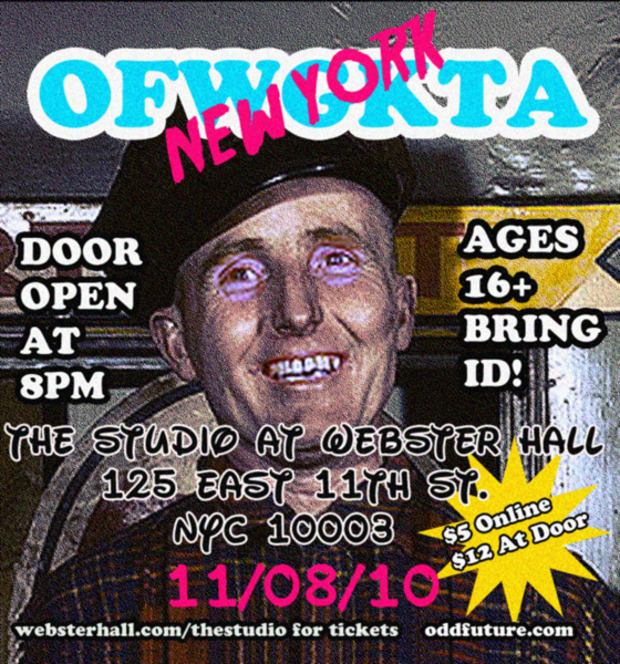 Feel free to ask Tyler and his OFWGKTA fellows what else they plan to spend their riches on in person next Monday, November 8th, in New York, when they play a show The Studio at Webster Hall (flyer after the jump). Tickets are $5 online or $12 at the door, but we have a couple pairs to give away for nothing. All you have to do is email us at info@thefader.com with "SWAG" in the subject, your favorite OFWGKTA lyric and your contact info in the body. We'll pick winners by the end of the week.