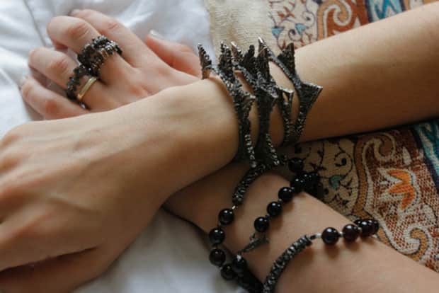 Jonathan Goldstein wanted to reflect his native El Salvador in the new season of his Bevel jewelry line, but he had one notable obstacle. “I don’t really have any solid ties to El Salvador,” says Goldstein, who was brought by adoptive parents to the US when he was only a few months old. “So I thought it would be cool to create some roots.” Without his own personal history, the New York-based designer looked even further back to El Salvador’s more ancient past. A collection of necklaces, rings, ear cuffs, and headpieces in different states of weathering—some pockmarked in silver and some new and shiny in gold—was the result of Goldstein’s burgeoning desire to meld sculptural artistry with symbolism derived from Mayan mythology. The ancient temples, sacred costumes and ornate relics’ ability to weather time with immense grace is a concept close to Goldstein’s heart. “I think we’re all artifacts in our own right, from when we’re born to where we are now,” says the designer. “We’re beautiful in every state.”