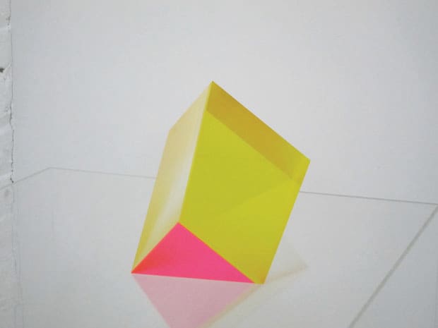 But technically you can’t call Low’s sculptures prisms because the geometry is imprecise and the surface is muted. Instead of color radiating from the bending of light through facets, Low fuses together colored and clear acrylic to create his spectrums. “I have limitations with size, due to [the capability of] my tools,” he explains, “but I want the work to be malleable. If you have this big thing then you lose that immediacy, that intimacy of wanting to move it around. It becomes this monument and doesn’t have that sort of sweetness,” he laughs,