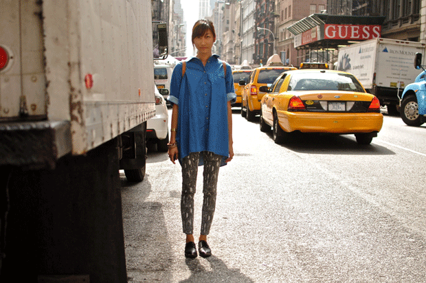 This girl was rushing back to work from her lunch break, a tough cookie who, to avoid the busy sidewalk shuffle, took to the streets. We love her black and white print pants, which reminded us of the marbled notebooks from our middle school days. Her shoes had a sick metal piece at the tip perfect for kicking ass and that thrift-store backpack had a really unique kind of paneled detailing that we've never seen before.