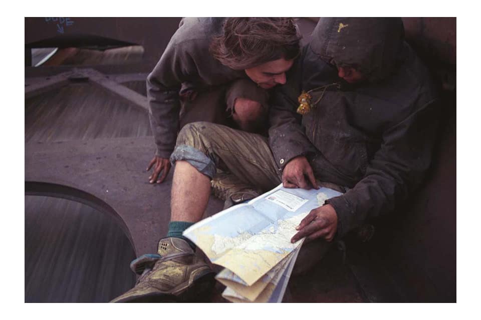 Despite growing up by train tracks and catching the occasional flash of slumped riders passing by out his kitchen window, Brodie got his first real look at hobo culture on a blind date with a punk girl who worked at a Chinese restaurant in town. “The date was we were gonna go to a This Bike is a Pipe Bomb show at the End of the Line Cafe, and she was punk with her dyed black hair, and there were these smelly young people dancing around barefoot and I thought, This is so cool! It’s ridiculous, but I don’t know where I’d be without the punk scene.” After that date, Brodie, fascinated, spent all his time studying this weird niche of society from the inside. He heard about train riding soon after and went off to do it.