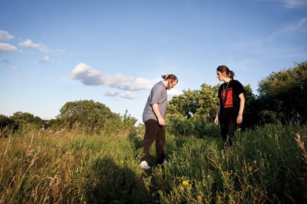 Nowhere is their nostalgia more sardonic than on “Minneapolis Belongs to You,” off the duo’s Ruin double-EP. With vocals nearly buried under turned-up jungle drums, Brooks quietly talk-sings When you’re dead, they will toast your life at your friends’ shitty DJ nights/ No one will hear their speeches clearly, they’ll all just think it’s someone’s birthday. The record’s b-side sees “Minneapolis” pitched down and recast nearly drumless, bobbing like lonely driftwood down a river of dense bass. In song and on the phone, it’s abundantly clear Elite Gymnastics feel isolated and unfulfilled in their hometown. “I feel like I needed the internet before the internet existed,” Brooks says. “There’s just so much stuff out there that could be really enriching my life that I don’t know about. Stuff deserves to be learned about. Stuff deserves to be cared about.”