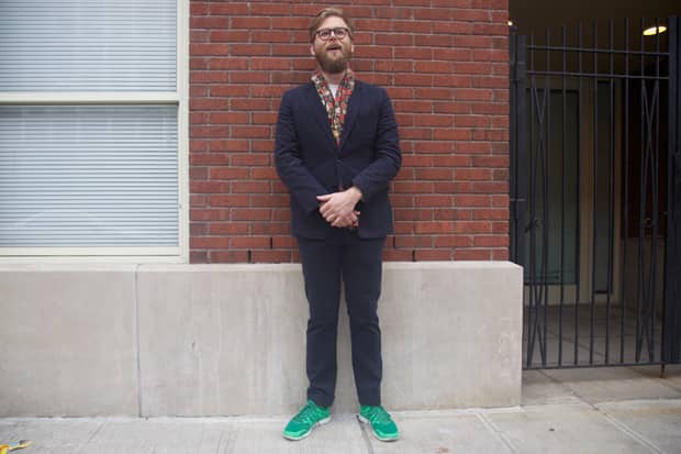 We snapped this dude partly for his floral scarf (could be by The Hill-Side?), partly for the perfect cut of his suit, but mostly for how well he's rocking a pair of athletic sneakers as a part of his look. We've been inching for months towards staying tech below our cuffs, and this dude shows us how it's done expertly.
