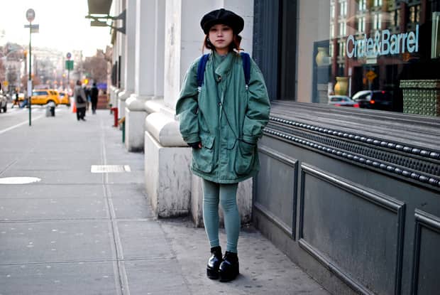 A monochromatic look is always okay in our eyes, but this girl's is even cooler because she keeps her mint-green ensemble lively with unexpected accessories. A floppy, over sized beret and shiny patent leather creepers are not an obvious match, but they make her look like an arty, spritely little elf in the best way.