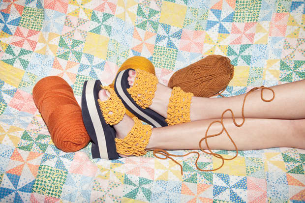 Arielle de Pinto got her start with crochet years ago in Montreal, where cold winters and a film-obsessed roommate meant untold couch hours and idle hands. When spring came, she stuck with it, and, before long, de Pinto swapped out yarn for fine strands of metal, which she crocheted into the loose-hanging spiderwebs of silver and gold spun into her eponymous and highly coveted line of fine jewelry. Now, in what would seem to be the total antithesis of both Canadian winters and sexy upmarket jewelry, de Pinto has collaborated with the Belgian artist collective LVMM to expand her craft to include chunky platform sandals.