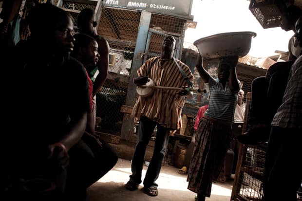 By Volume 7, Bola had linked with the house producer at Park FX studio in Kumasi, who “programs the drum patterns and beats to suit” his voice and kologo, augmented by Gulugu drum and wia—a wind instrument. Along with another Bola tape, the cassette found its way to Brian Shimkovitz, who runs the Awesome Tapes from Africa blog and label, and soon he realized how serious Bola was. “I picked up the phone and dialed the number on one of the tapes,” Shimkovitz says. “The person on the other end didn’t speak English, so I started speaking Twi.