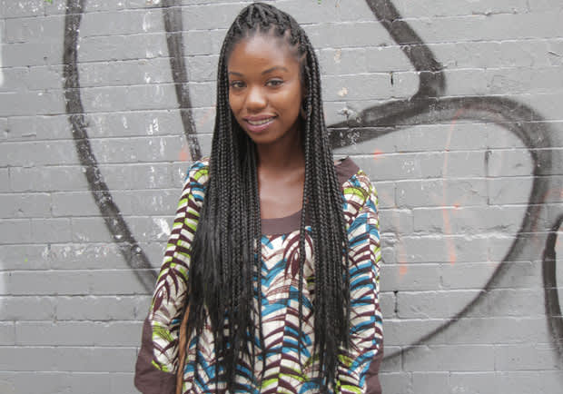 The first thing we noticed about this young lady were her long braids tied up on top, like Janet Jackson in the 90s, a sort of Poetic Justice braid comeback. She also told us her mother brought this dress directly from Kenya, and it was the very first time she wore it when we spotted her. Her colorful Kenyan dress, faded pink lipstick and simple, off-white Converse give her a little-girl big-city vibe and we love the whole package.