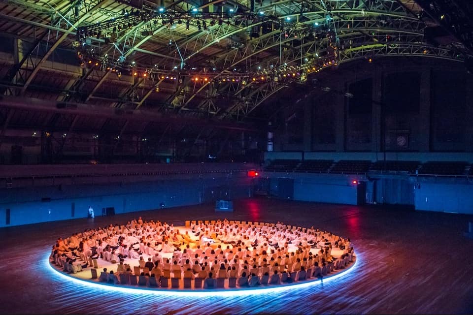 The Armory commissioned visual artist Rirkrit Trivanija to give the illusion of a visit to the lunar landscape, and his approach is effective: guests remove their shoes, don white robes and comfortably recline in seats placed on an elevated circular platform in the middle of the hall. The audience faces the centrally-positioned Pasveer, and thanks to the white tunics and the clean design, one has a sense of stepping into a distant utopia or occult spiritual gathering. A composer in the audience whispered to his neighbor suspiciously, “This all feels very German,” while another audience member whispered to her friend, “I want to come here to die.”