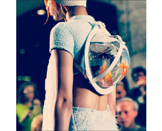 Not sure if purchases will come complete with live fishies, but this week, at the closely watched graduate collections for prestigious London fashion college Central Saint Martins, student Cassandra Verity Green sent a water-filled knapsack complete with goldfish down the runway for her senior thesis show. What with the Lil B-inspired thesis at Parsons in NYC last week, art school kids are finding inspiration in unlikely places and, like they should be, pushing the creative boundaries of fashion, but Green gets extra pops for making what might be the first article of clothing that requires feeding and cleaning. (via Susie Bubble's Instagram)