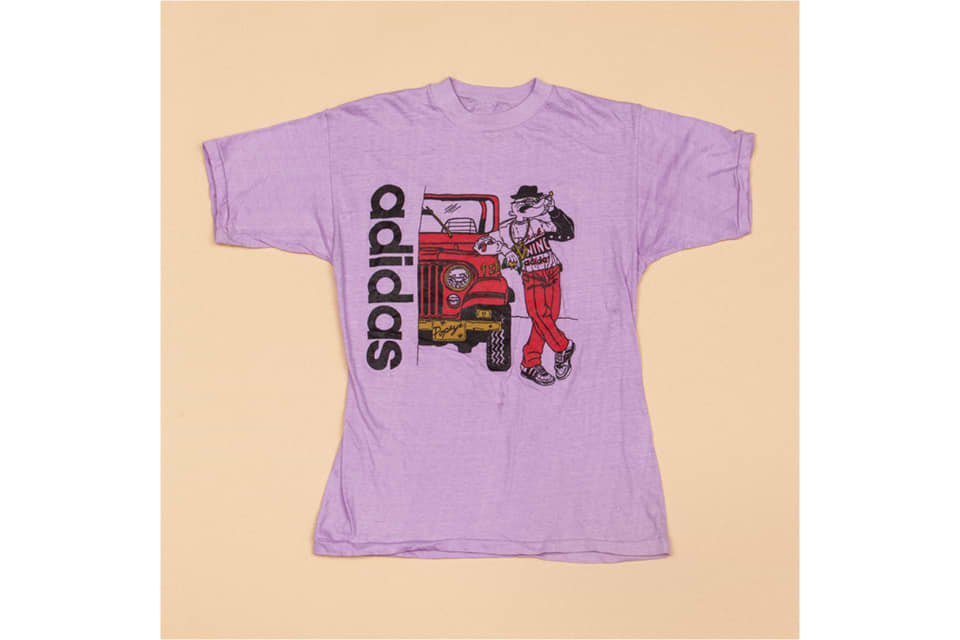 This is probably the greatest Adidas shirt that Adidas never made. It’s a product of the crack era. These were amazing urban bootlegs silkscreened by mom and pop shops and distributed throughout urban cities in America in the late ’80s. The amazing thing about this particular shirt is the way Popeye is dressed— [in] a Patrick Ewing crewneck that was a really famous style made by actual Adidas when they had a deal with Ewing. He’s also about to hop in and drive a Wrangler, which at that time was a drug dealer status ride. Everybody wanted to become a