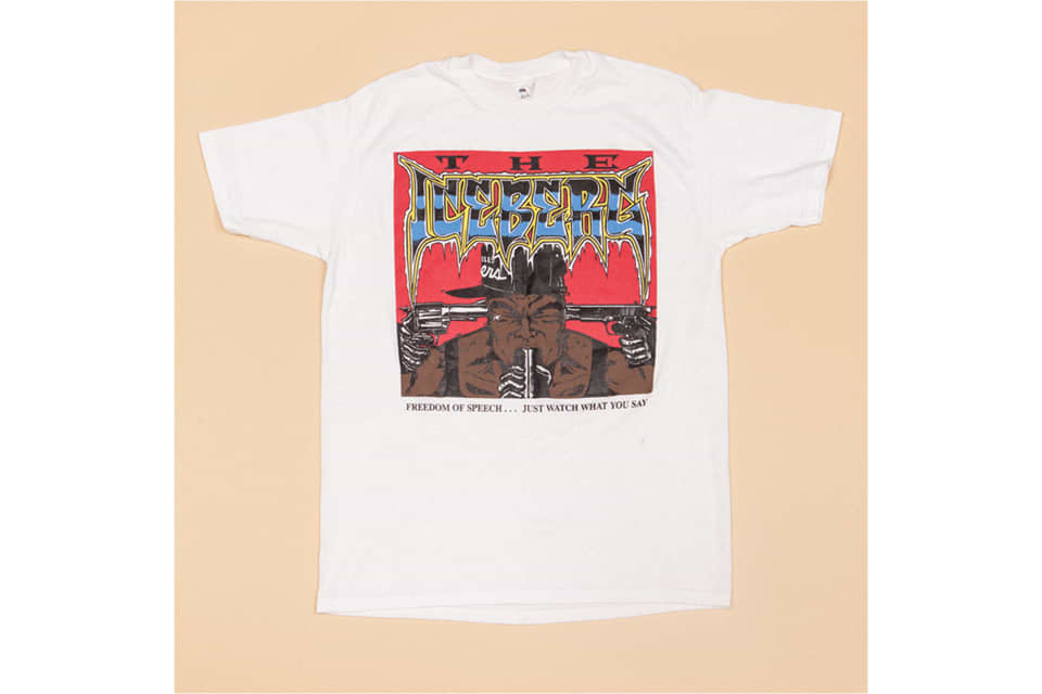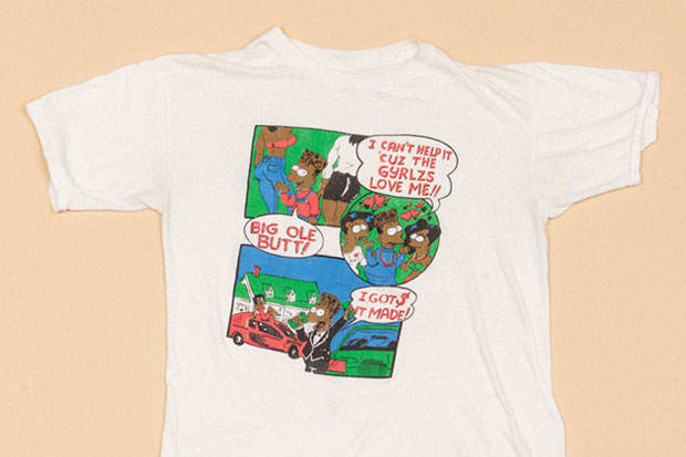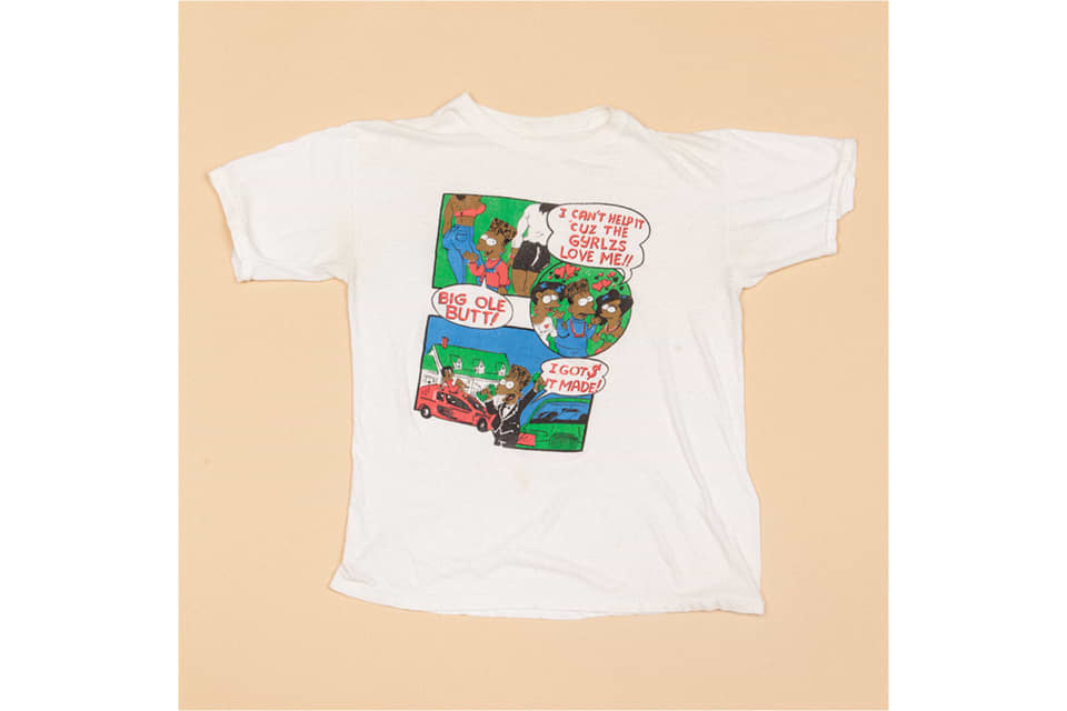 The Simpsons debuted around the same time hip-hop, Public Enemy and Spike Lee were really making their mark, and Black Bart was a response to the phenomenon. It was all about the idea of being your own boss and life in the hood. Fox made all this merchandise for the show but they had no intention of selling it in urban communities, so people just made Black Bart tees in their houses. Here, “big ole butt” absolutely has something to do with Spike’s movie School Daze and the butt dance. I love the pit stains on this one. Sometimes, I’ll wash out the stains on a tee, but for this one, the shirt’s so rare that I think pit stains are important. They’re almost like the rings of a tree.