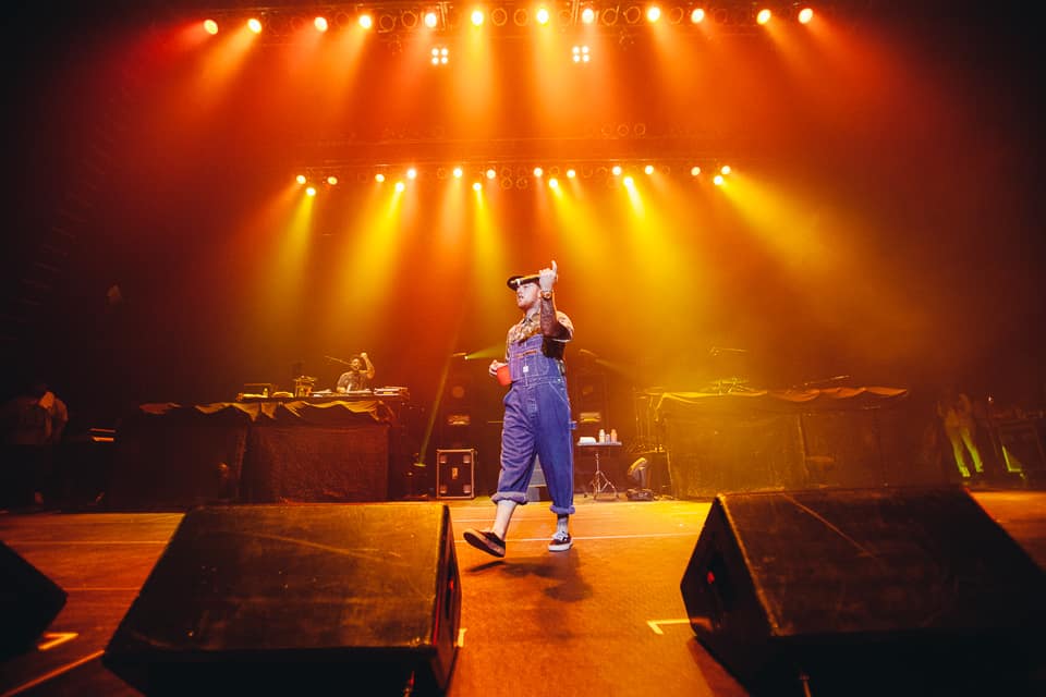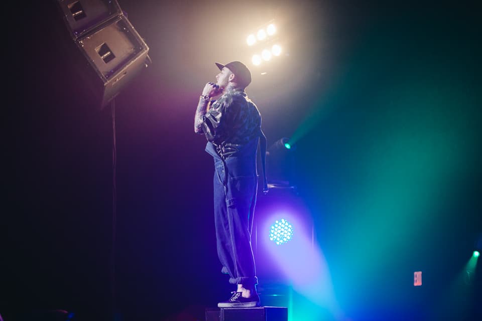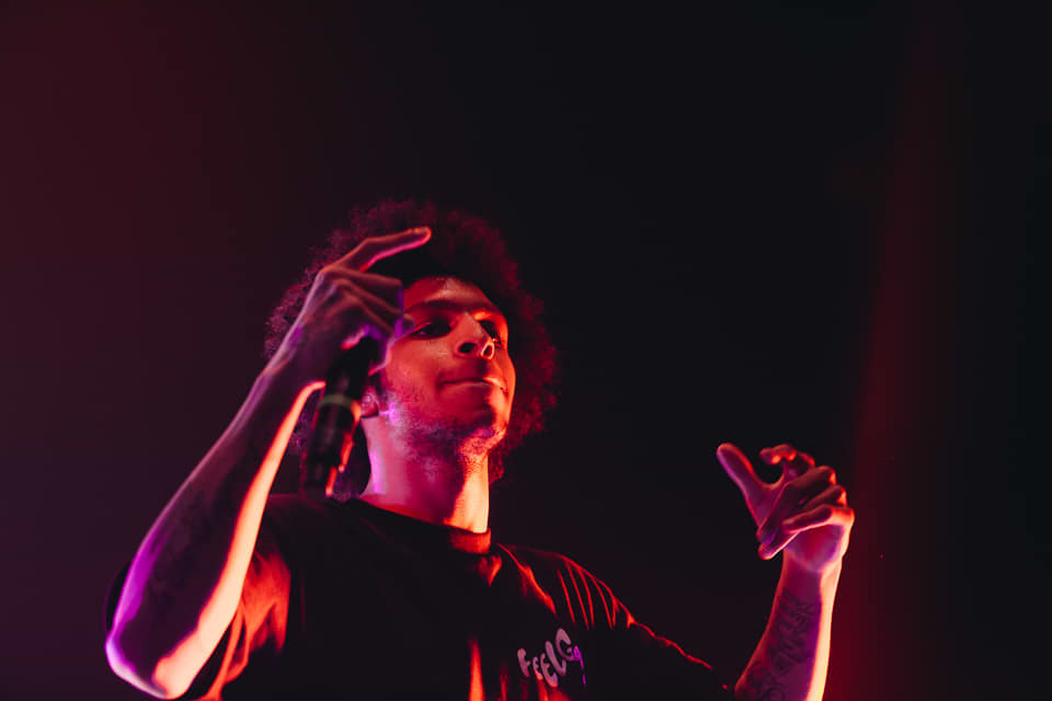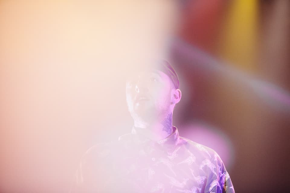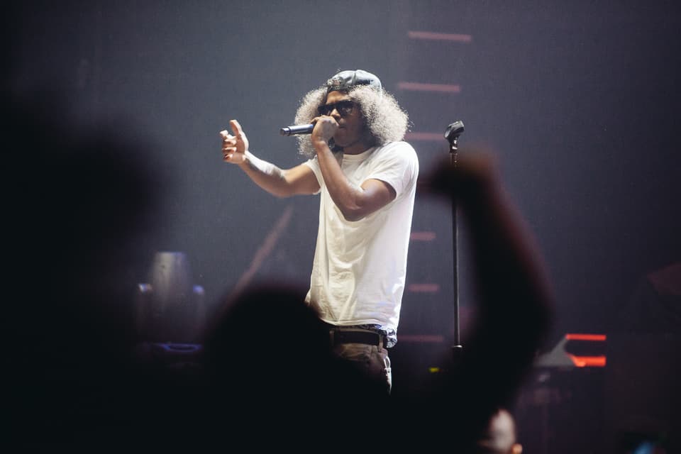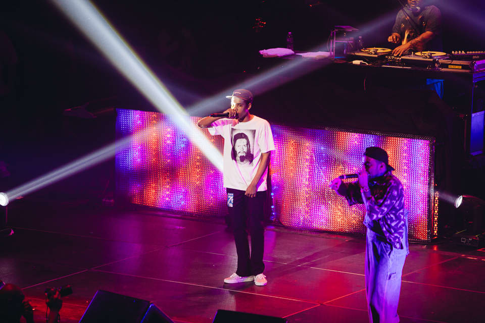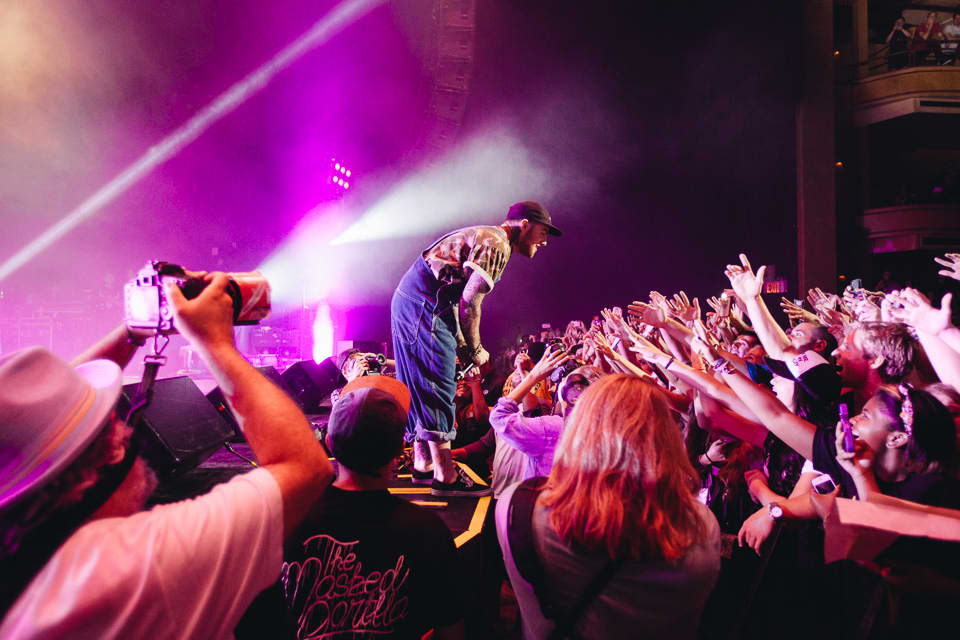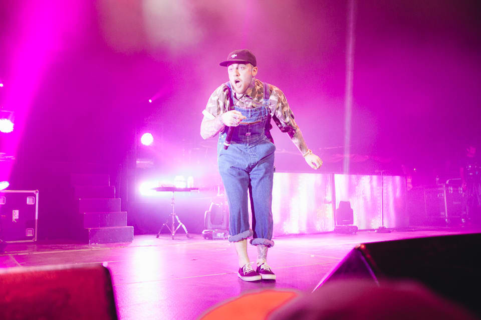 After the string of openers, the lights dimmed and a grainy, static-soaked voice radioed in from the deep cosmos.The crowd erupted in a swirl of purple lights and heavy fog, and soon Mac had crash landed on stage wearing denim overalls (purchased during an earlier FADER TV shoot) and a mischievous grin. He swigged from a bottle of Jameson whiskey between bars on opener “Loud,” and churned through the first half of his hour-plus set with a slapstick energy, sprinting, leaping, and fake passing out to his fans’ delight. These were diehard Mac Millerites who knew every word, and Mac half-seriously addressed the progression they’ve watched closely since day one. “It’s been a weird year for me,” he confessed between cuts. “Everybody always asks, ‘What happened to Mac? Where did all these big ass chains come from? Oh I know what it is. It must be the drugs!” he said before launching into "Red Dot Music," his collaboration with Action Bronson and Loaded Lux from Watching Movies. Later Earl Sweatshirt, in town after performing in a tiny garage for vitaminwater and The FADER's #uncapped series on Monday, also popped up. “Give it up for yourselves, white people!” he shouted after their collab “I’m Not Real,” and didn’t overstay his welcome. The same can’t be said for Mac, who brought The Internet back out to shift gears into a smoky jam band set that, if lovable, simply went on too long. Between live renditions of his Flying Lotus collab “SDS” and the infamous Lord Finesse-jacking “Kool-Aid & Frozen Pizza,” Mac covered a rockabilly song, played an extended (extended) guitar solo behind his head, and rapped the theme song to the Fresh Prince of Bel-Air. By the time he fired up a chant of “Thank You Based God!” many in the crowd were fatigued, and some kids toward the back streamed out early. But spontaneity was key to the spirit of his set, and it’s clear that Mac is currently having the time of his life. If this eccentric phase of his career continues to provide bigger platforms for fellow artists as engaging as these, the better for all of us to sit back and watch.