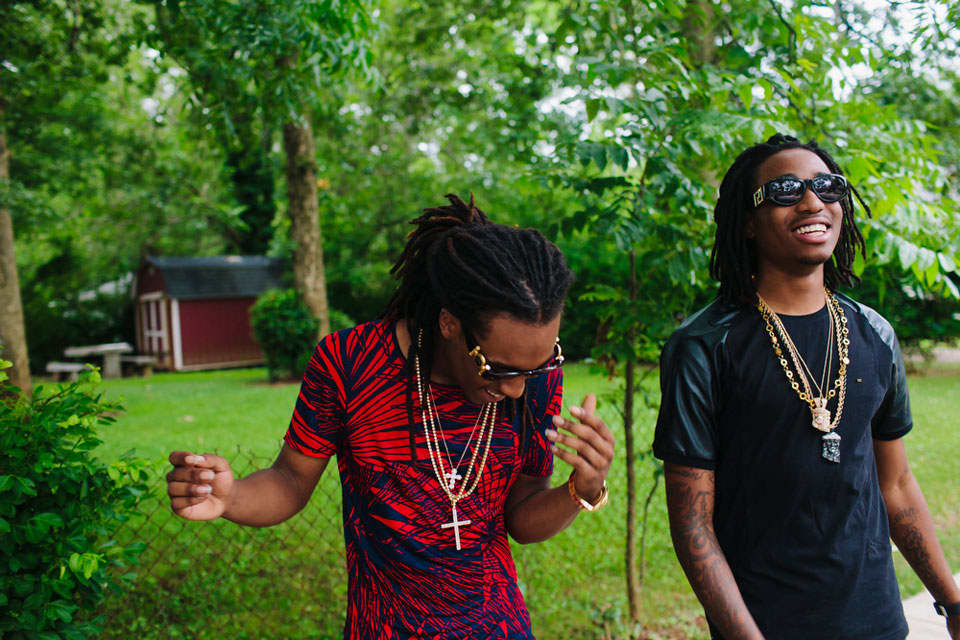On the afternoon before their June mixtape, Young Rich Niggas, is to be released, two members of the rap trio Migos stand huddled in a hot, windowless studio in southwest Atlanta. They watch the tape’s final mix-down on a screen perched just below a security camera feed offering 16 different perspectives of the building’s exterior. Friends and associates weave in and out of the room, interrupting with last-minute changes to the tape’s artwork and scheduling details for live appearances every night of the week. Trinidad James’ people are waiting on the phone. “I notice the buzz, but you try not to pay attention to it,” says Quavo, 22, the oldest of the group. “Makes you lazy.” His 19-year-old nephew and fellow member, TakeOff, who also wears his long, thin dreads draped over designer shades, smiles and agrees: “It’s a day job and a night job.” Migos’ third member, Offset, is absent, incarcerated midway through the mixtape’s recording for reasons the pair decline to discuss. “He’s ready to get out,” says Quavo. “He’s getting back on the train real soon.”