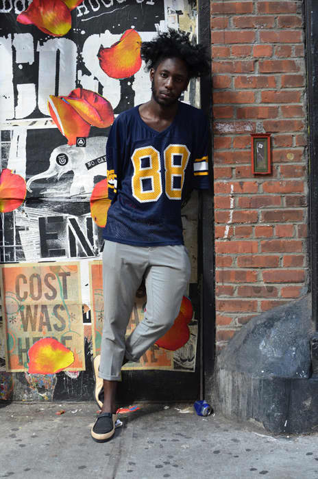 We told you last year that football jerseys were a trend, and lately we've been seeing guys and girls all over town rocking 'em. By dressing his up with some more formal trousers, this dude wears the look well.