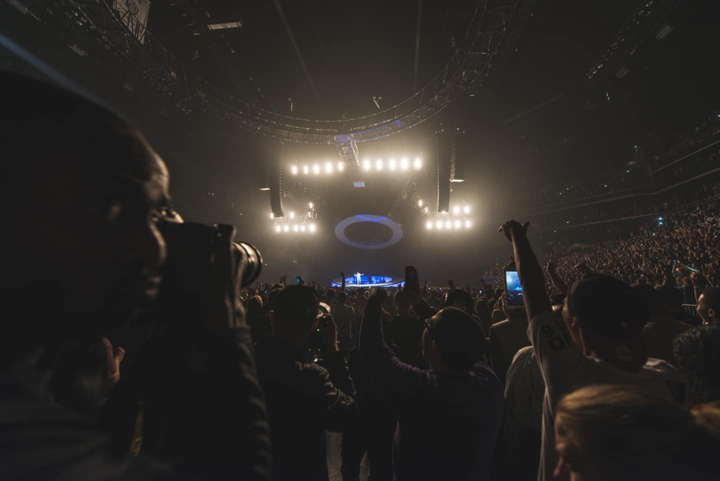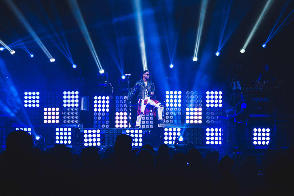Earlier in the night, OVO-signee PARTYNEXTDOOR played songs from his debut mixtape in complete darkness. Future performed an energetic opening set on a tiny sliver of stage, running from old hits to new ones with DJ Esco, his partner since his strip club days, at his side. Newly engaged, he dryly solicited the "single ladies" in the room; more charmingly, he pronounced "Barclays" like "Barkleys." He played to the crowd directly in front of him, seemingly unaware of the people filing into the arena's upper echelons, until "Turn on the Lights." The lights dimmed and phones blinked. "They got a lot of love for me, it's only right they do that," said Future. Still, songs like "Chosen One" beg for a full arena, not the half-full one Future opened for, and I'd like to see him take more ownership of the newer songs he's written and gifted to others, like "Bugatti" and "I Wanna Be With You." He performed those as snippets, but if Future had let them play out and marched around the stage just grinning, as Drake did later when he brought Future out to do an enormous rendition of "Sh!t," I think people would have happily cheered him on. Miguel's set, which followed Future's, was a flash of talent, leather tassels and disgustingly chiseled abs. To be a rock star, he's practiced and practiced; in comparison, Future's performance seemed small. But I like that when Future performs, it feels as if he may as well be in the audience, just any guy singing along. That connection to the crowd is crucial—Drake had to build a floating doughnut to make sure his stays strong.