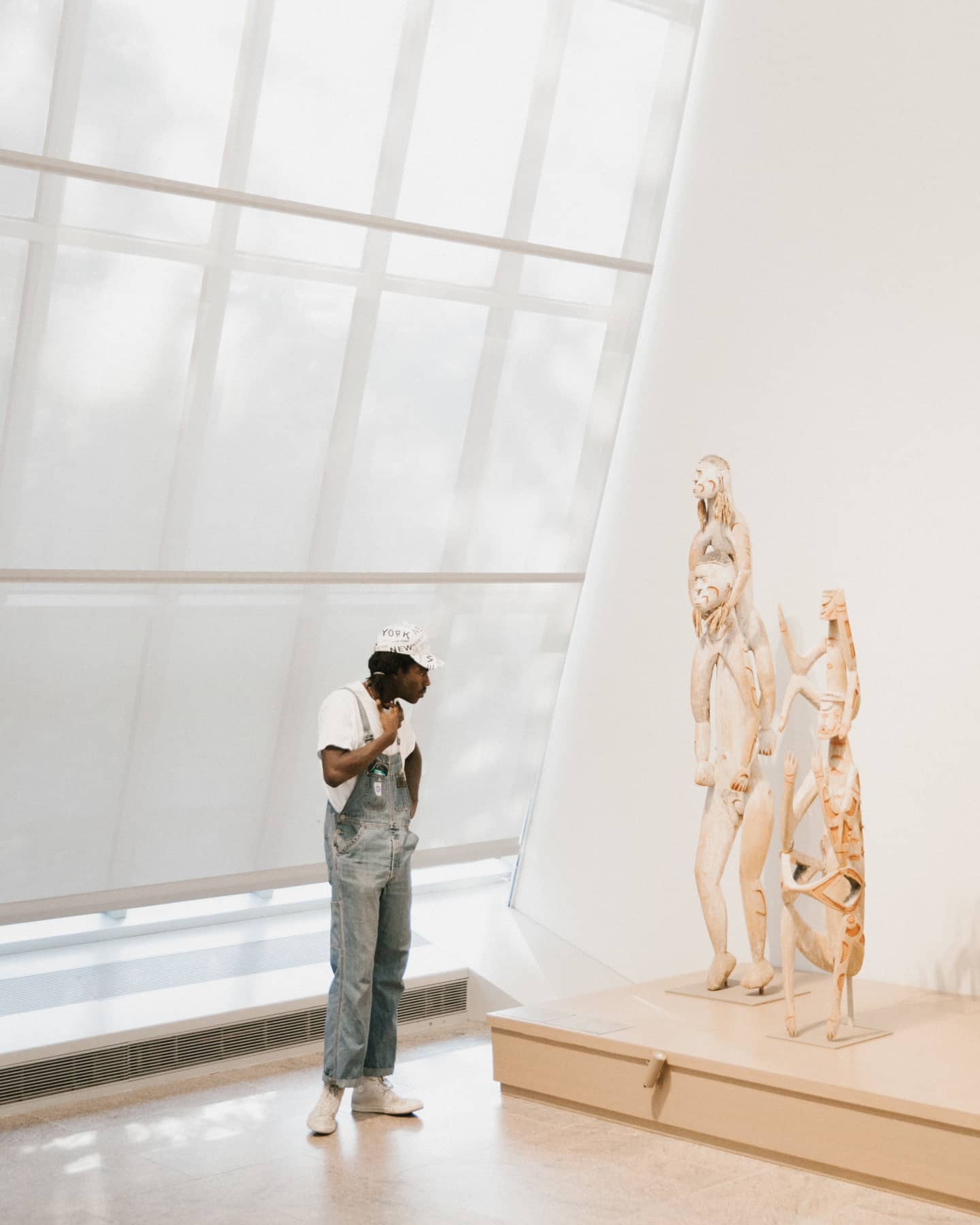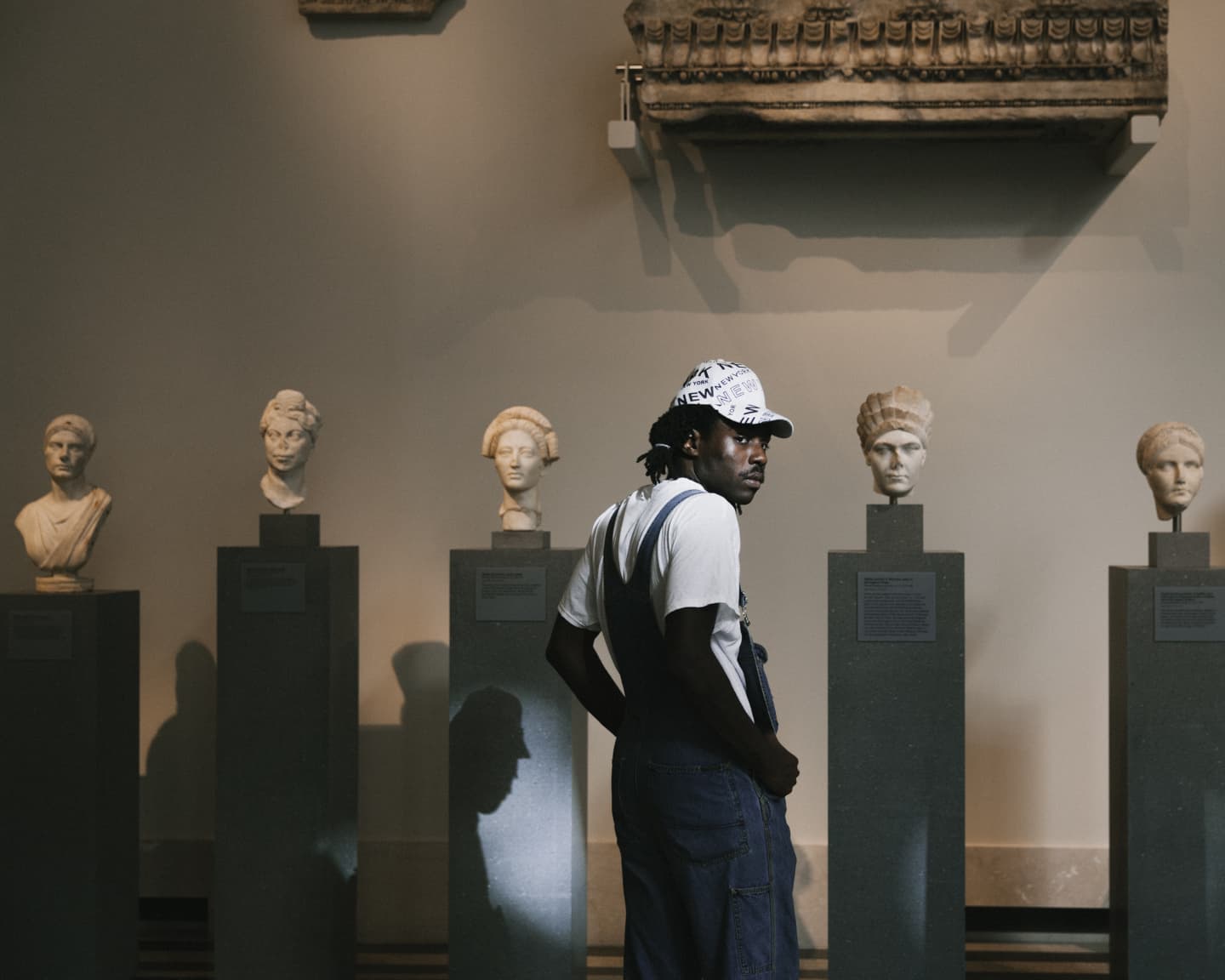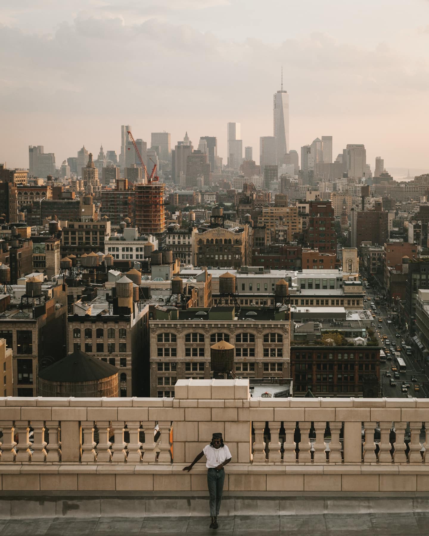 Though Dev Hynes has been a New York resident for around seven years, he still loves the city like a tourist. He even looks like a tourist, albeit one from 1982. On an early fall afternoon trip to the top of the Empire State Building, he’s wearing a black turtleneck underneath a bright red button-down, pants hiked high on his calf and a white baseball cap from a souvenir shop embroidered with “New York” in black letters. He’s tall and skinny with a big white smile that opens like a Steinway, and he’s got a stretched-out plastic bag from the MoMA gift shop wrapped around his wrist, stashing inside an old SLR camera, a notepad and a Hershey’s Symphony bar that he occasionally pulls out to nibble on. The elevator guy recognizes him from frequent visits. “I’m a regular,” Hynes says to me, and laughs. Since his first trip to the top last year, he’s paid the $27 admission 10 or so times, often with his girlfriend, singer Samantha Urbani, who’s with him today and has packed gluten-free sandwiches for the trip in her backpack. “My favorite view is the northwest,” he says. We’re so far above Manhattan that you can actually see the end of the city and green beginnings of the suburbs above The Bronx. Sometimes, because of a condition Hynes has called synesthesia, which links the senses of sight and sound in his brain, the city’s noisiness can overwhelm him, especially at crowded bars. But he likes the way the Empire State Building sounds. “It’s a G major ninth up here,” he says, scribbling that fact in a notepad. Before I can ask him how he’s worked that out, he’s wandering away, ducking between tourists to snap his own picture of the New Jersey coastline.
