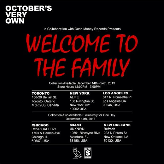 Between announcing his first run of OVO Jordans and donning custom Calvin Klein on his Nothing Was the Same Tour, Drake has had a very stylish past few months—not to mention the one-day pop-up shop he opened in New York, Toronto, and Los Angeles, in promotion of his new album, where the rapper passed out free gear. Now Drake will opening pop-ups in the same three cities plus Chicago, Miami and New Orleans for one day only on December 14th, from 12pm-7pm, where he’ll debut the “Welcome to the Family” collection in collaboration with his label, Cash Money Records. No word yet on what the collection entails but, if Drake’s recent collaborations are any indication, it’ll be dope—check out locations below.