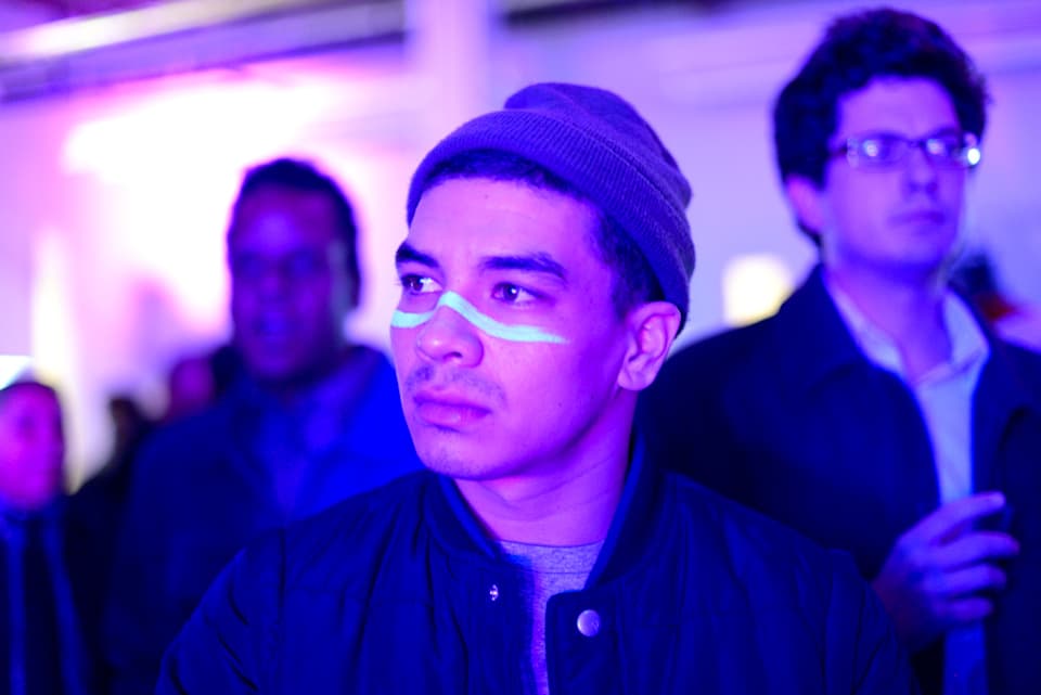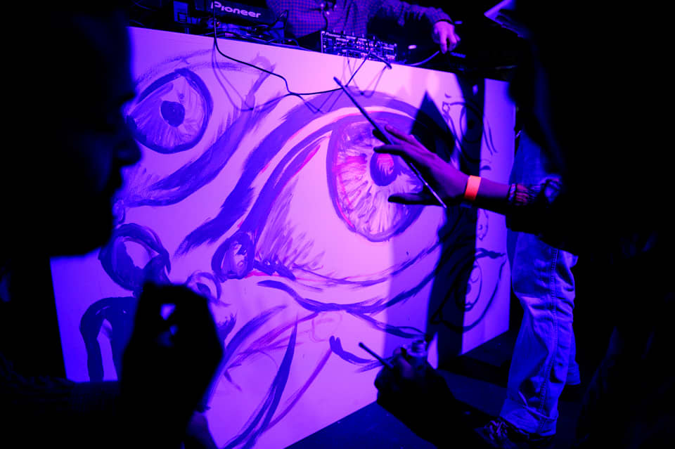 As Paz, the next act, set up his enclosure onstage, local musician and artist Rex Hamilton began painting a backdrop of eyes and a reclining figure on the white canvas facade facing the audience. Asked whether or not his spontaneity was actually part of Paz's performance, he shook his head. “I was going to keep going until they told me to stop,” he said. Paz’s music compliments Wet’s in that both artists are rawly emotive, but he looked to be laboring hard under the duress of running his stage show and singing and rapping, seeming most relaxed when he took over the boards and didn’t need to leap back and forth between the front of the stage and the back.
