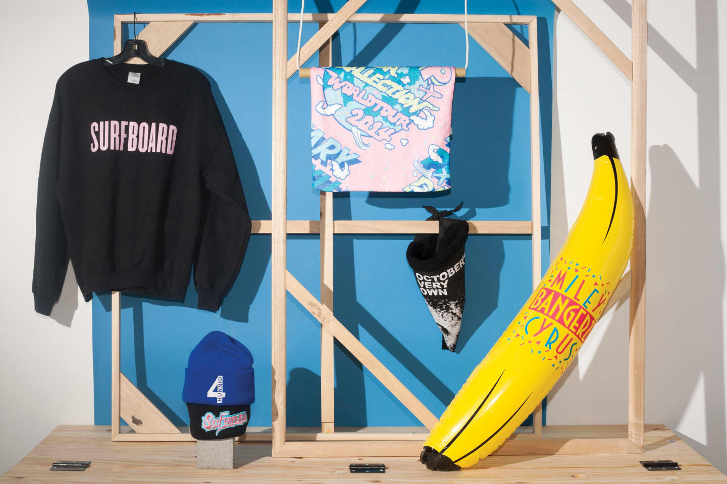 Most merch since has been an endless stream of junk: album art screen-printed onto cheap black T-shirts, dorm-room posters of press photos and trinkets with only a vague association with the music they represent. But in the past year, merch has once again become an integral part of the pop music landscape. This might be Kanye’s doing (his Yeezus tour swag is a gold standard), but every star now seems to take designing products almost as seriously as making songs. Artist-affiliated brands like Drake’s October’s Very Own have blurred the divide between merch and straight-up covetable streetwear. Odd Future has become as much a lifestyle brand as a rap collective; their LA pop-up store, filled with hoodies, socks and tie-dyed tees, is just a few doors down from Supreme.