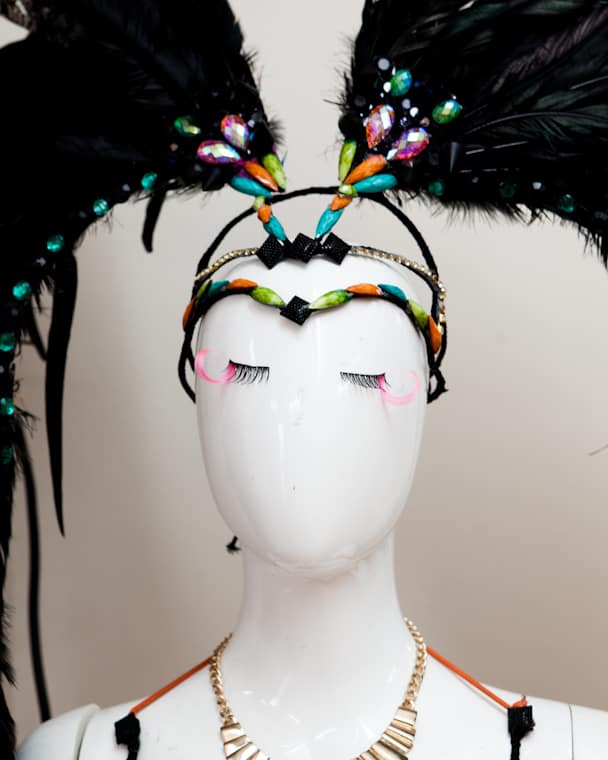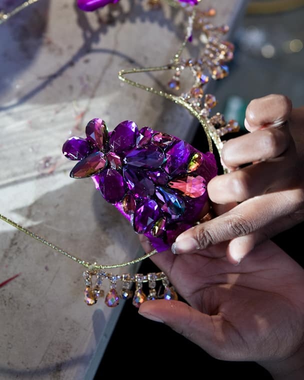 • Reishelle's father, Percy, quietly crafts all the headdresses amidst the madness of production.