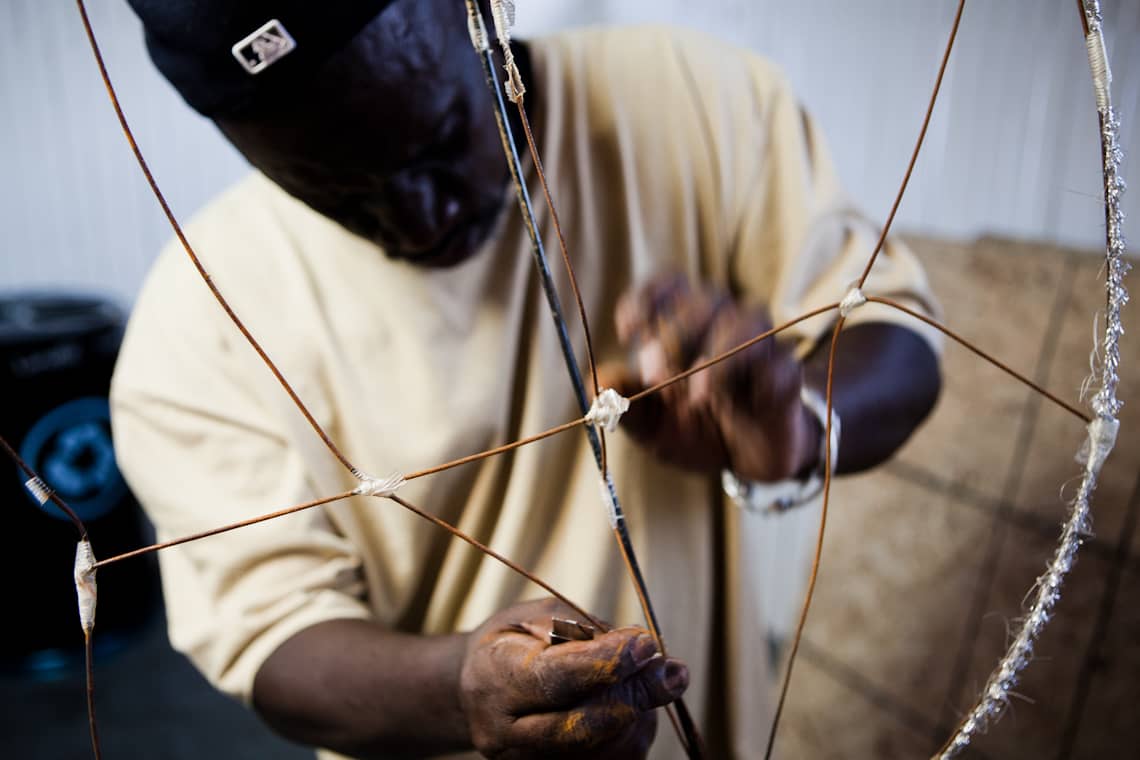 • Older craftsmen mend wire frames that will buttress the most elaborate costume, the 20-foot king of the band.