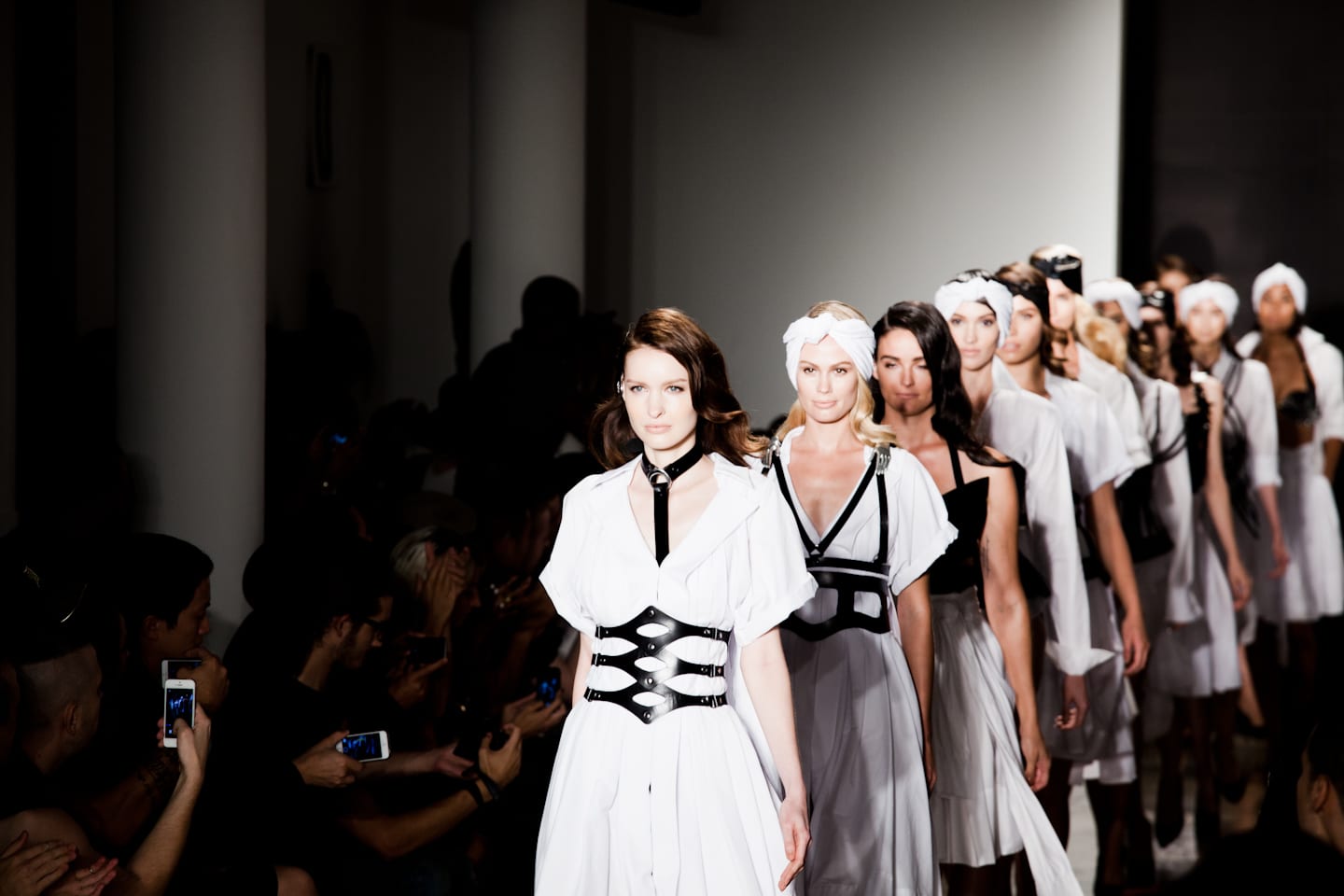 It's easy to gaze over the sprawling New York Fashion Week Calendar—although "week" has long-since ballooned to around 11 days—and know exactly what you're in for. A relatively predictable assortment of cerebral and pretty womenswear and preppy and/or hype-friendly menswear that all cater to the commercial side of the apparel business. Save a handful of outliers—Hood By Air, Luar Zepol, Rodarte,Telfar—NYFW's prevailing aesthetic is as daring as a pair of pleated-front khakis. So, we were rightfully stoked to see two designers present collections that might marginally be considered traditional womenswear, but truly push the boundaries of Fashion with a capital F and augment the female body in interesting ways. Known for her cage-like bustiers and futuristic versions of 18th century crinoline, designer Becca McCharen of Chromat, presented her collection "Formula 15" as an armor that reconsidered the geometry of the human form. Zana Bayne, a bondage and leather afficionado, created "Moonbathers," a 25-look collection that originated in Stepford Wife-gone-naughty white dresses and crescendoed in star-studded slinky metallic sheaths. We went backstage for a quick glimpse at the preparation that went into each collection, and to hear first hand how McCharen and Bayne seek to redefine the female body with each strap, buckle and studded bra they put forth.