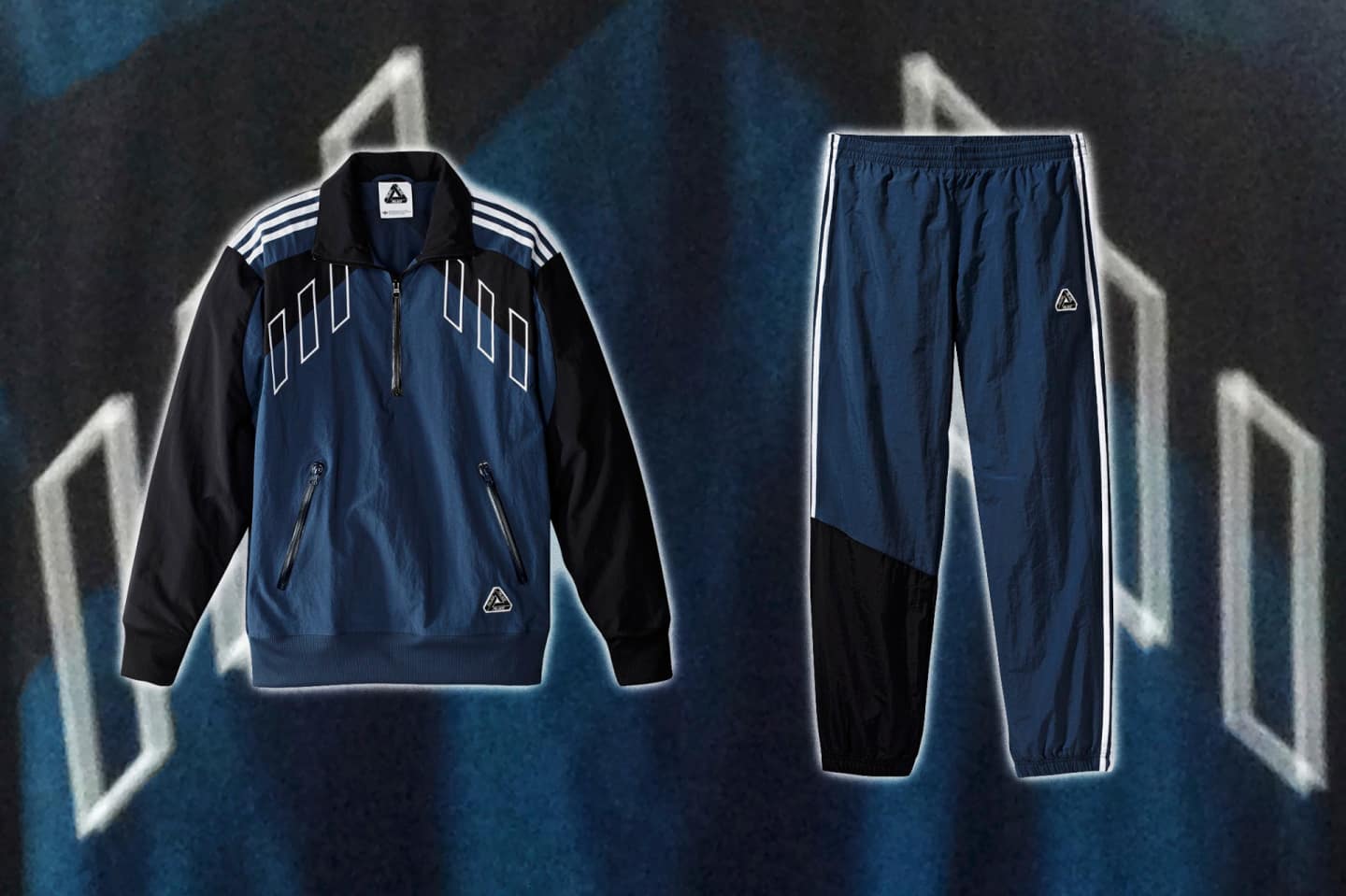 adidas Originals x Palace has finally dropped the images for their collaboration and, as speculated, there are full sweatsuits. There's also Adidas/Palace co-branded bucket hats that are sure to pop off, along with sweatshirts, a navy work jacket, and some kind of tactical vest? The collection plays off the kind of Euro-retro-sports-utility-vaguely-militarized vibe that was present in the first teaser vid, but aesthetically the throwback shapes and colors read really fresh. Adidas' eye for color combined with the geometric possibilities Palace's logo affords has given us something truly cool. Pics below, lookbook video-ish thing above. Cop the actual clothes September 27.