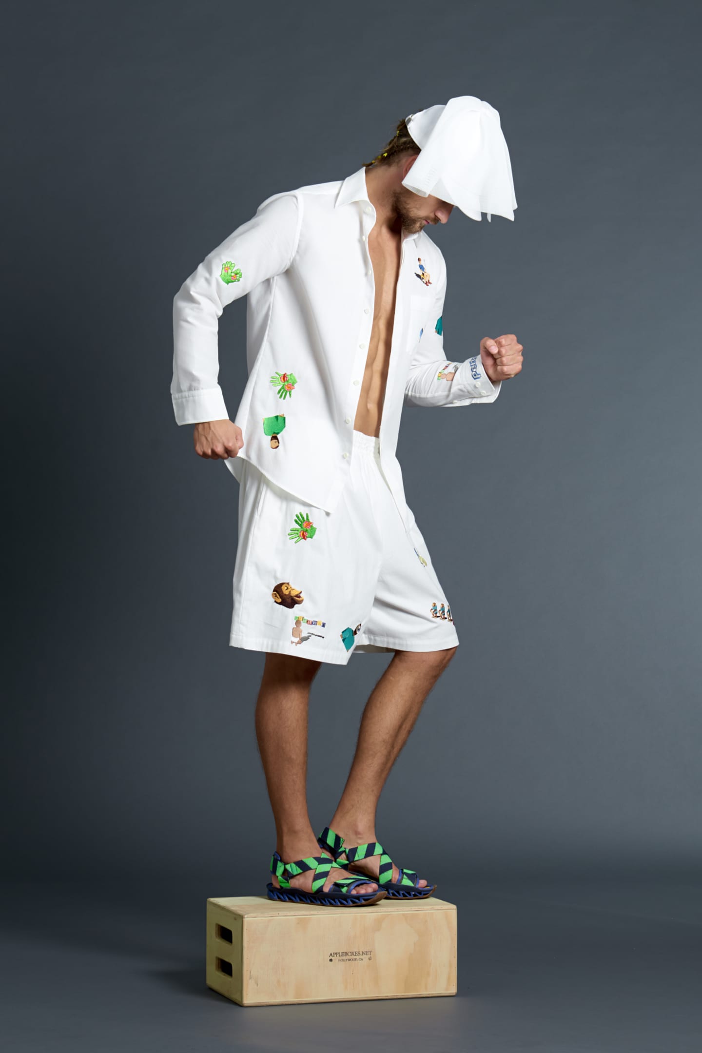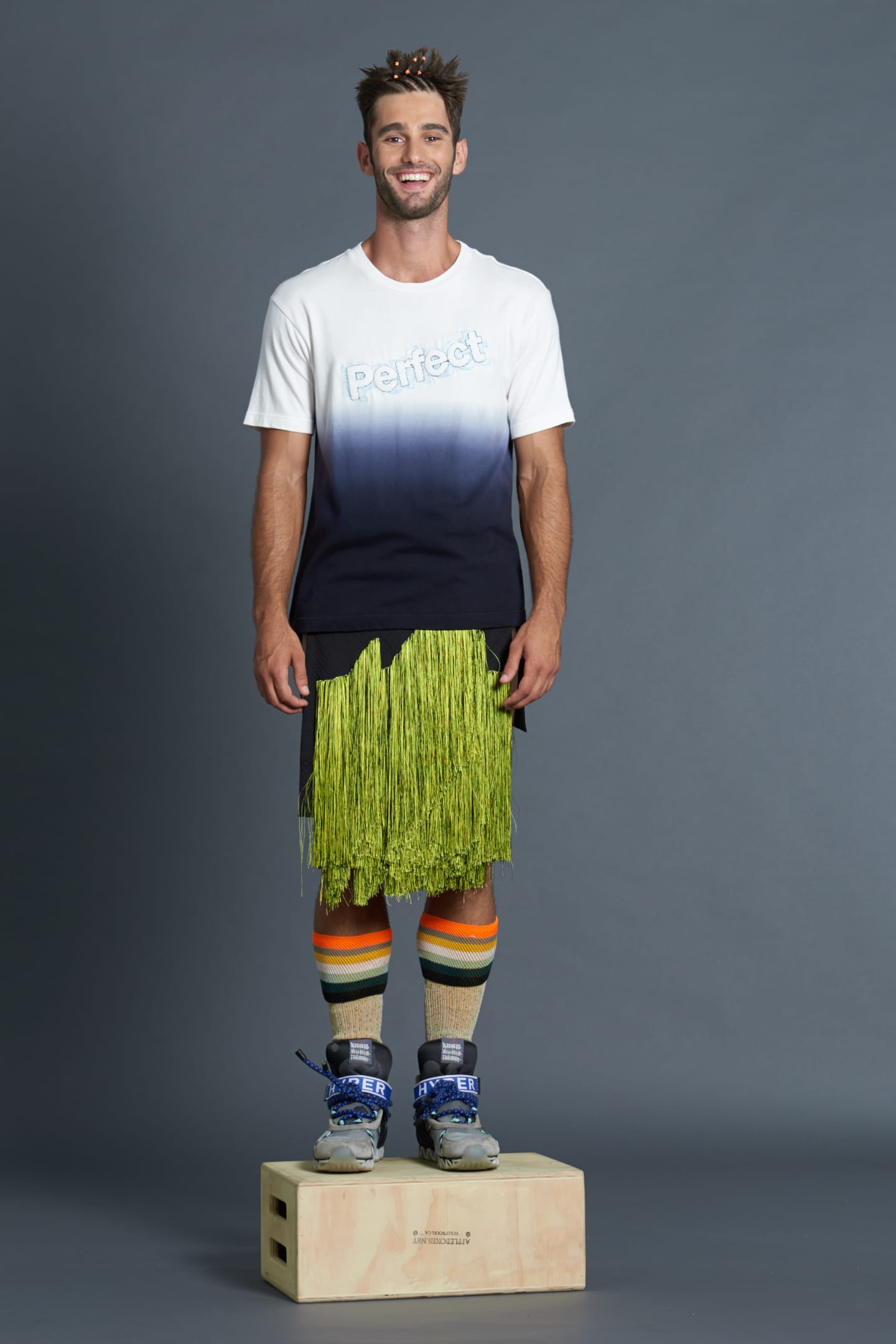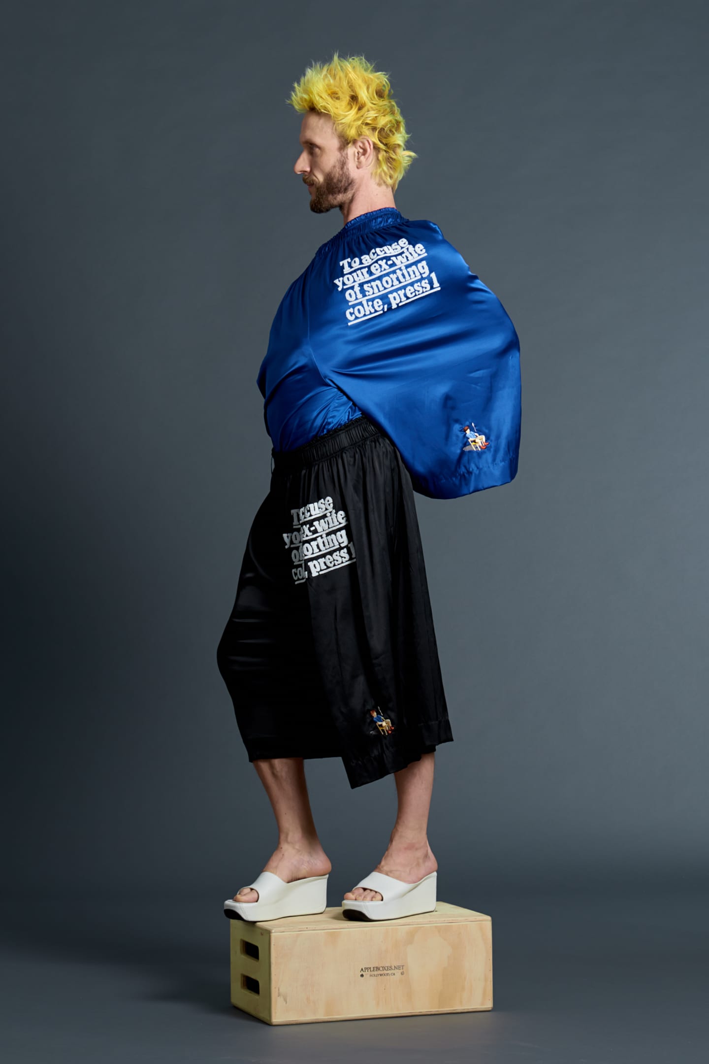 One of the first to precipitate the prodigious rise of bright colors, bold prints and graphic text after the minimalism of the 90's, Bernard Wilhelm's brilliant, demented spring collection is as strange and innovative as anything he's done before. The collection itself is like a bright, surreal cartoon you happen upon when you're watching TV really stoned at like 2am, and you can't tell if it's actually as fucked up as it seems. Wilhelm throws fabrics and colors together with abandon; the real unifying elements of the collection are in the details: the drape of a neckline, a dusting of fringe, kimono-inspired detailing. There are some sure fire conversation-starters in the mix here, especially one-shouldered silk dresses that bear the elaborately beaded slogan, "to accuse your exwife of snorting coke, press 1," and "America's Next Mop Todel" t-shirts. An accompanying press release is equally fiery, a free-form poem with lines like, "could Michelle Obama be pregnant? And by whom?" Click through the lookbook below to immerse yourself in Wilhelm's futuristic raver vision, then click here to see the even trippier lookbooks, but don't blame us if it feels like reality is slowly slipping away.