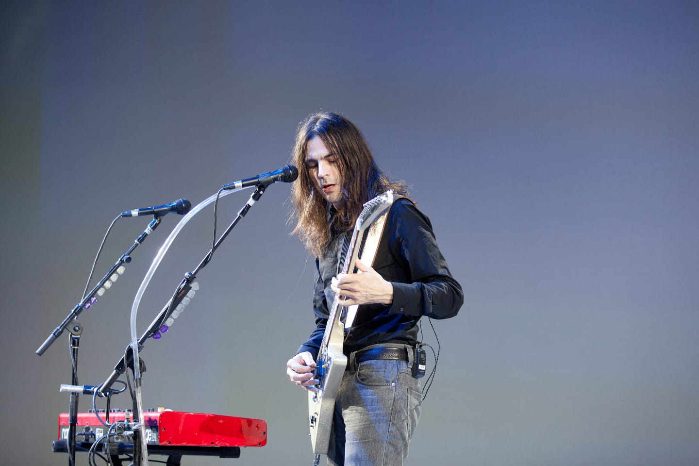 Last night in Austin, we were on site at the opening Dell World Event for live performances from Duran Duran and Weezer. Extreme rain and flash flood warnings drove the outdoor concert into the Austin Convention Center, but the unfavorable weather did not stop concertgoers from a night of excellent live shows, delectable consumptions, and good company. Guests indulged appetites with bites from 12 food trucks including Coolhaus, East Side Kings, Hat Creek Burgers, and Stonys Pizza, dining upon indoor picnic tables and mock grass set up to preserve an outdoorsy vibe. The co-headliners played animated hour-long sets including classic hits like Weezer's "Say It Ain't So" and "Buddy Holly," and Duran Duran's "Ordinary World" and "The Wild Boys," all before a impressively immense projection screen set up behind the stage projecting cool band graphics. The set up was just as impressive as the live stream Dell provided for us at last month's FADER FORT.